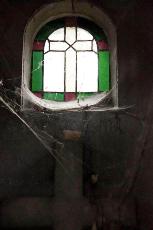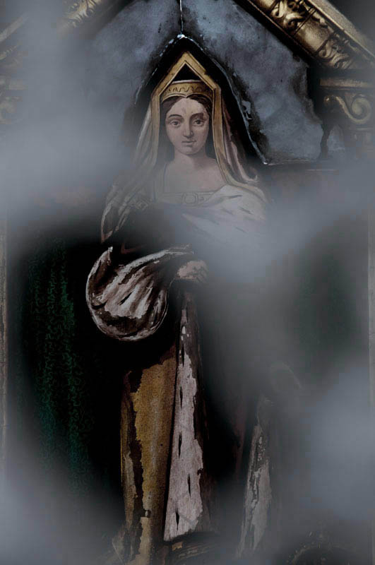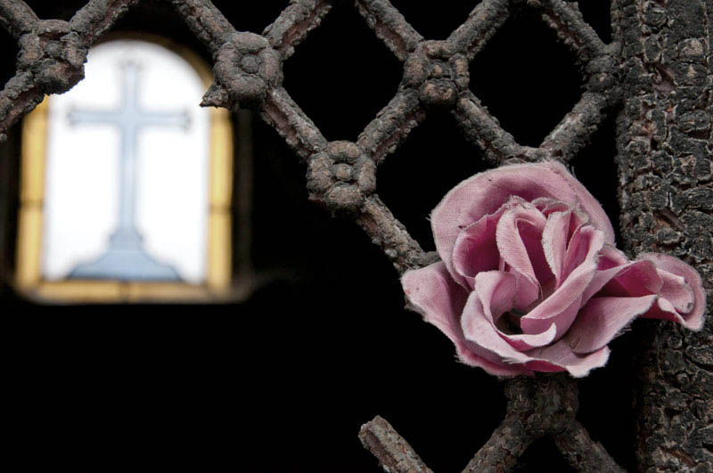 Blumen, religiöse Symbole und architektonische Elemente erscheinen als stille Spuren eines Ortes, an dem sich Zerbrechlichkeit und Dauer überlagern.